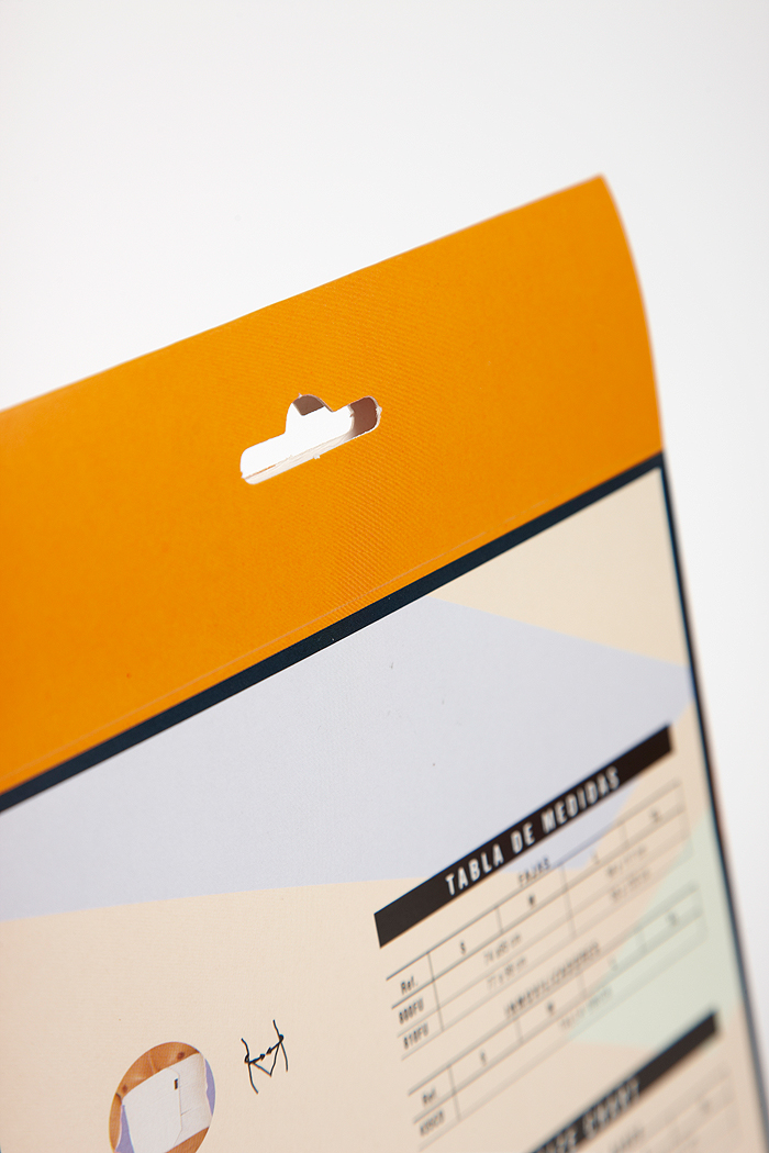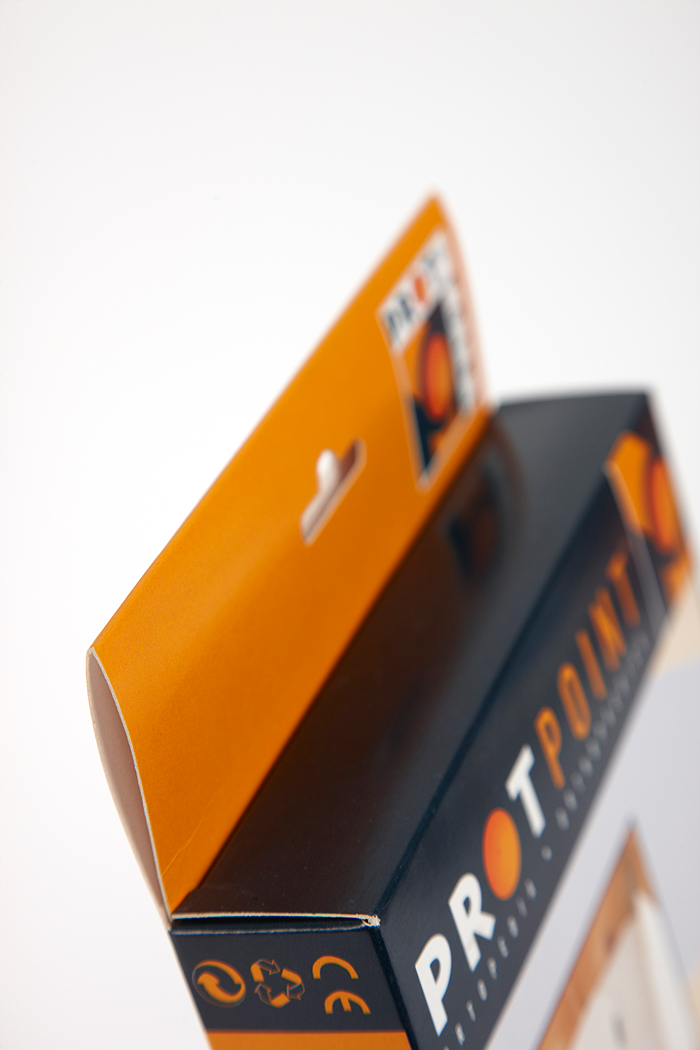 Estuche con un pegado lateral + doble colgador sin pegado. Se consigue una mayor resistencia y durabilidad del colgador a los signos de fatiga sufridos por el cartón.