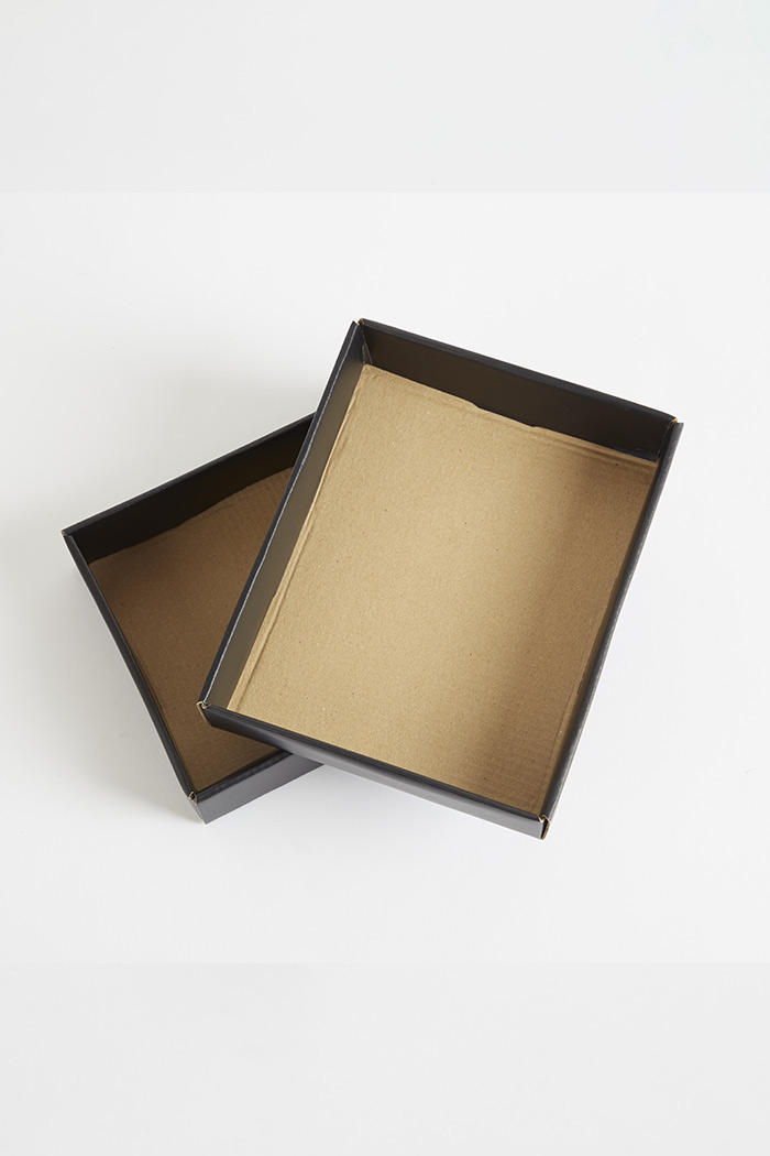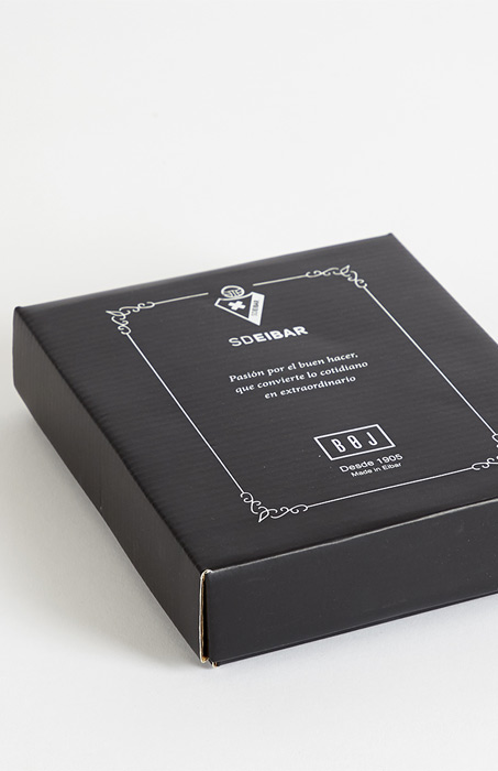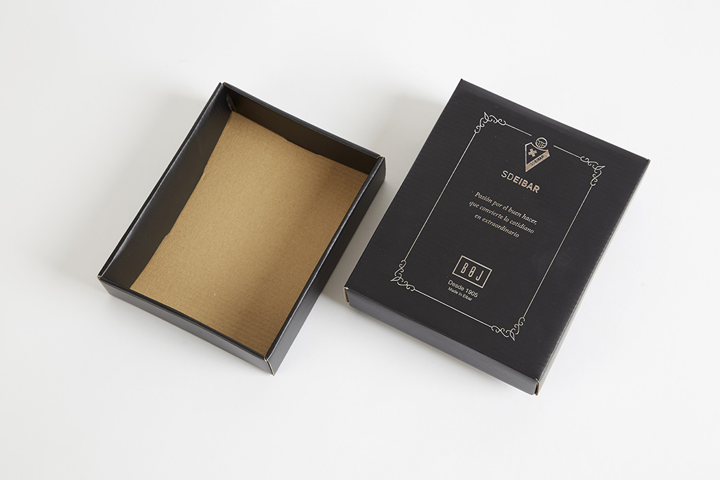Estuche formado por tapa y fondo. Acabado en plastificado mate y estampación plata.